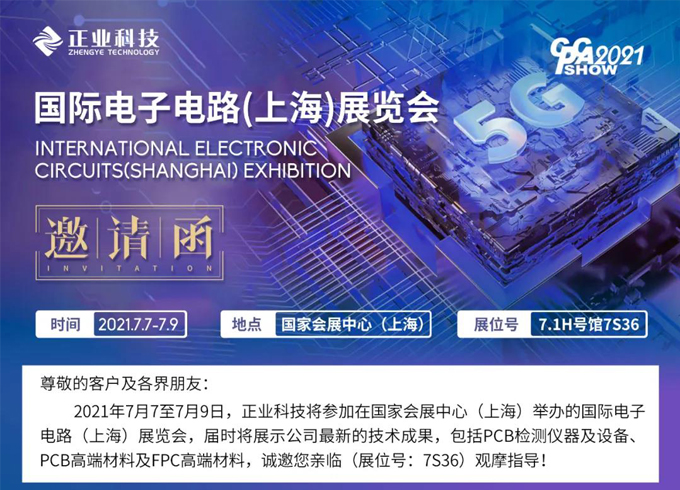 2021年7月7至7月9日,正業(yè)科技將參加在國家會展中心(上海)舉辦的國際電子電路(上海)展覽會,屆時將展示公司最新的技術成果,包括PCB檢測儀器及設備、PCB高端材料及FPC高端材料,誠邀您親臨(展位號:7S36)觀摩指導!